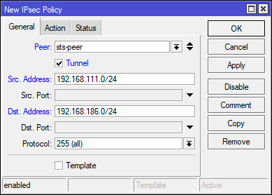 В целом того, что мы уже настроили достаточно для установления защищенного соединения, но IPsec не VPN и работает по-другому. Для того, чтобы трафик начал шифроваться он должен соответствовать одной из политик IPsec, поэтому перейдем в IP - IPsec - Policies и создадим новую политику. В поле Peer укажем созданное ранее соединение, ниже установим флаг Tunnel для работы соединения в туннельном режиме, в поле Src. Address укажем диапазон собственной сети - 192.168.111.0/24, а в поле Dst. Address - диапазон удаленной сети - 192.168.186.0/24.