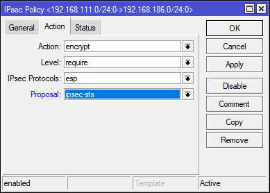 Затем на закладке Action установите Proposal - ipsec-sts, предложение которое мы создали ранее.