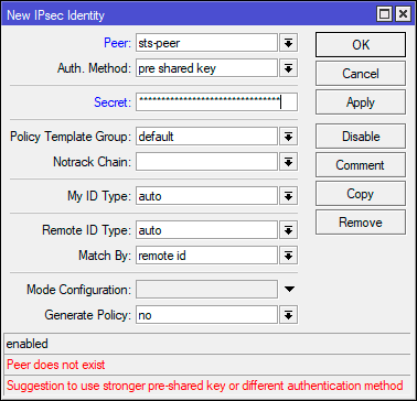 Ну и осталось совсем немного - научить узлы идентифицировать друг друга, так как оба роутера контролируются администратором и настроены принимать подключения только от другого узла, то мы будем использовать аутентификацию по предварительному ключу. Перейдем в IP - IPsec - Identities и создадим новую настройку идентификации. Здесь нам нужно заполнить поля: Peer - указываем созданное нами соединение, в нашем случае ipsec-sts, Auth. Method - pre shared key, Secret - предварительный ключ. В качестве предварительного ключа рекомендуется использовать строку с использованием цифр, букв в разных регистрах и специальных символов, сформированных в случайном порядке и с длинной не менее 16-32 символов. Не следует использовать в качестве ключа словарные слова и фразы. Предупреждения внизу окна можно проигнорировать.