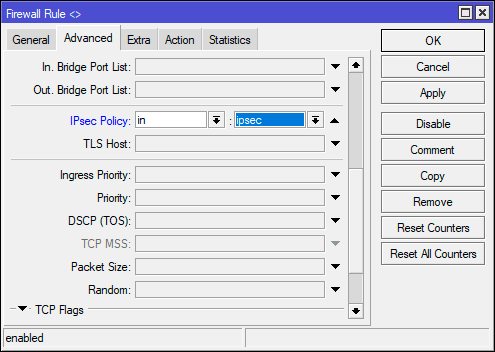 Для того, чтобы пакеты из одной сети могли попасть в другую, следует разрешить их транзит. Создадим еще одно правило: Chain - forward, In. Interface - внешний интерфейс - ether1, затем на закладке Advanced укажем IPsec Policy - in:ipsec. Это разрешит транзит любых входящих пакетов, которые попадают под любую установленную политику IPsec.