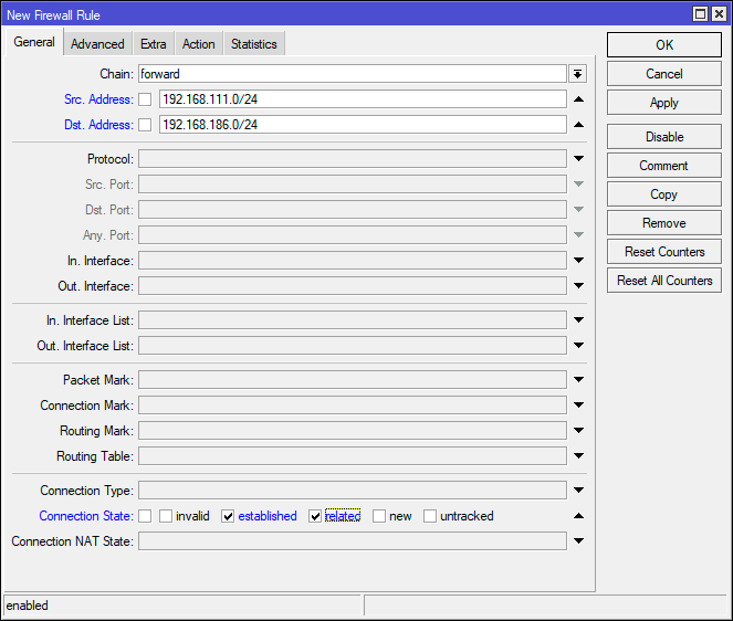 2add chain=forward action=accept place-before=0 src-address=192.168.111.0/24 dst-address=192.168.186.0/24 connection-state=established,related