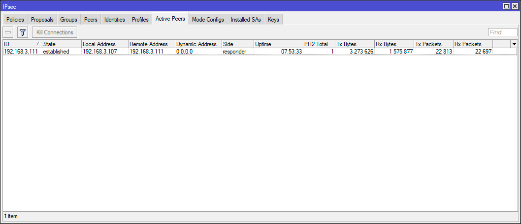 После того, как мы завершили процесс настройки перейдем в IP - IPsec - Active Peers и убедимся, что соединение между двумя узлами установлено. Если это не так - еще раз проверяем все настройки и изучаем файл лога, скорее всего у вас не совпадают параметры шифрования или идентификации.