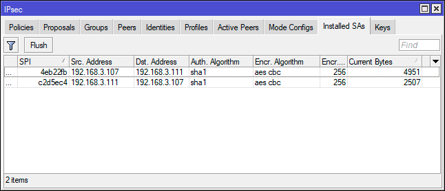 Теперь откроем IP - IPsec - Installed SAs. В терминах IPsec - SA (Security Association) - ассоциация безопасности, обозначает установленное защищенное соединение. Для каждого соединения создается отдельная пара SA, так как каждая SA - это однонаправленное соединение, а данные нужно передавать по двум направлениям. Если запустить обмен данными между сетями, скажем пропинговать с узла одной сети узел другой сети, то мы увидим, что данные счетчика Current Bytes начинают меняться, а следовательно, шифрование работает и данные передаются внутри защищенного соединения.