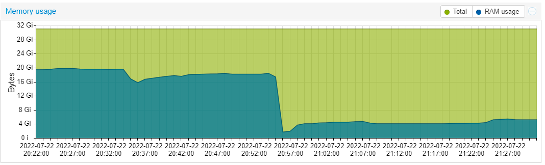 При этом многие в оценке потребления памяти ориентируются на показания веб-интерфейса Proxmox VE, который не совсем верно отражает действительность. Например, глядя на такое можно подумать, что определенный запас по памяти есть.
