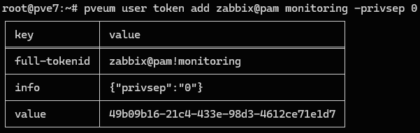 1pveum user token add zabbix@pam monitoring -privsep 0