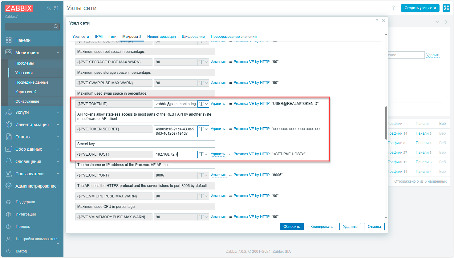 - {$PVE.TOKEN.ID} - идентификатор токена, в нашем случае zabbix@pam!monitoring