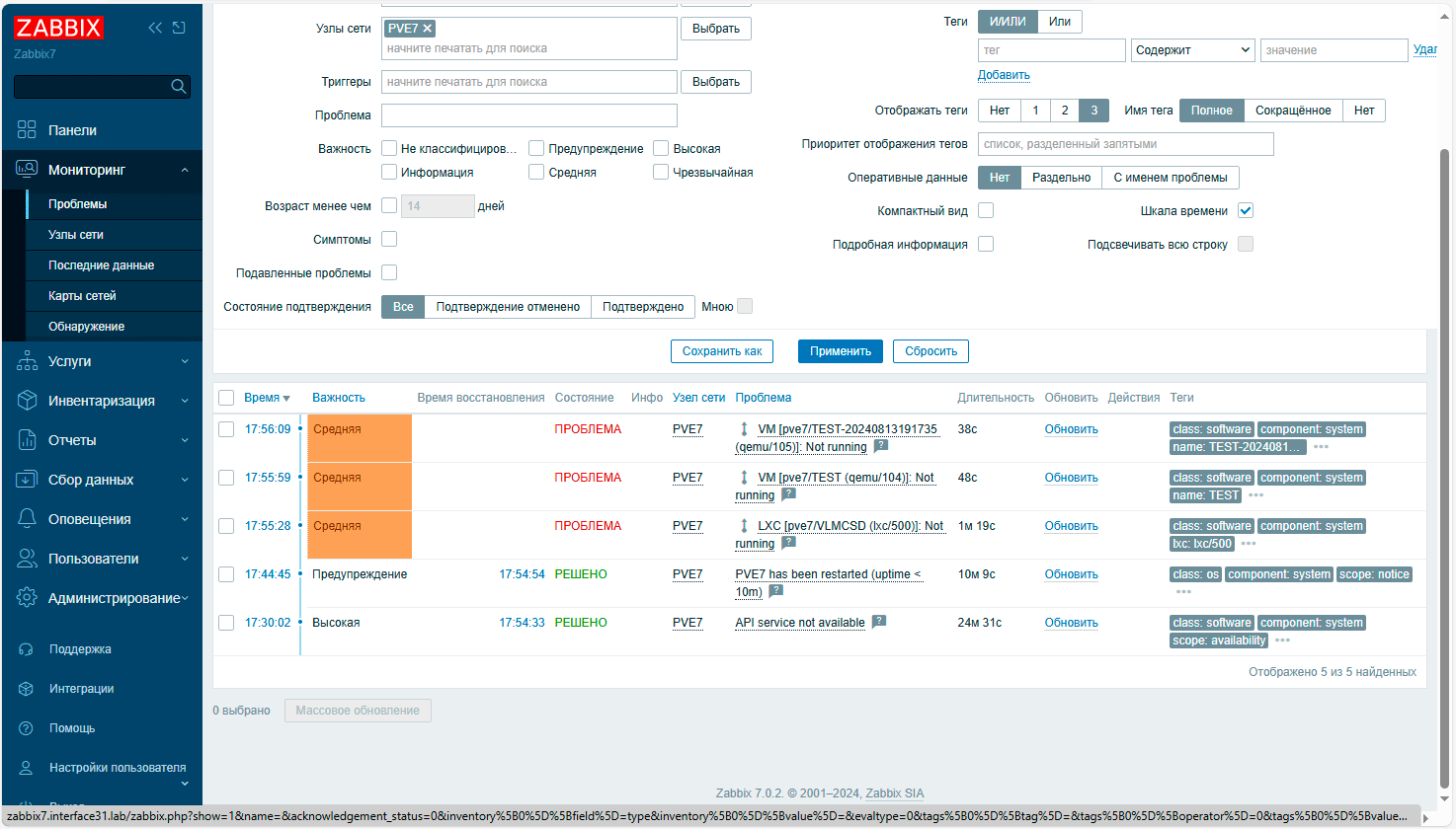 Также пошли первые срабатывания триггеров, например, Zabbix сразу же уведомил нас о том, что некоторые виртуальные машины и контейнеры на узле не запущены.