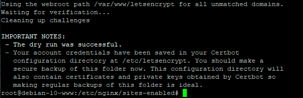 Ключ --dry-run указывает на тестовый режим, --webroot задает используемый плагин, в данном случае работающий с уже имеющимся веб-сервером. Опция -w указывает рабочую директорию, которую мы настроили ранее, а через опцию -d задаются домены и поддомены, для которых мы хотим получить сертификат. Если все прошло успешно, то вы получите лаконичное сообщение: