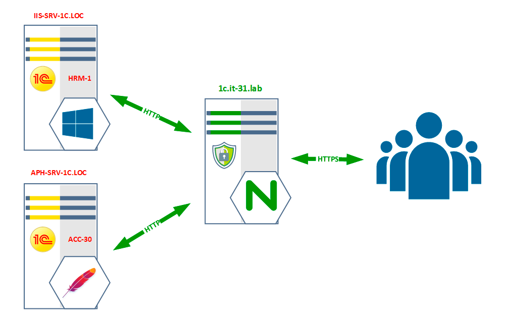 Почему именно NGINX и именно обратный прокси? Давайте разберем простой пример: в нашей сети есть два условных сервера 1С, каждый из которых имеет веб-публикации, допустим на IIS и Apache. Оба сервера используют одни и те же порты и просто так одновременный доступ к ним организовать не получится, как минимум один из них придется размещать на нестандартном порту, что не добавляет удобства в эксплуатации.