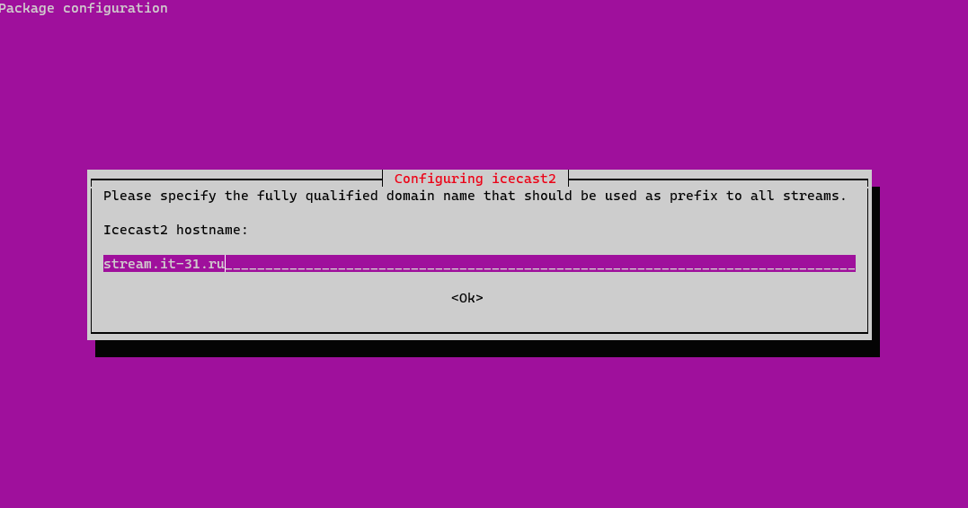 Если вы ответили согласием, то вам потребуется ввести полное доменное имя (FQDN) вашего сервера. Вы, конечно, можете использовать короткое имя, несуществующий домен или IP-адрес, но в этом случае вы не сможете получить сертификат Let's Encrypt. В нашем случае будет использоваться доменное имя stream.it-31.ru