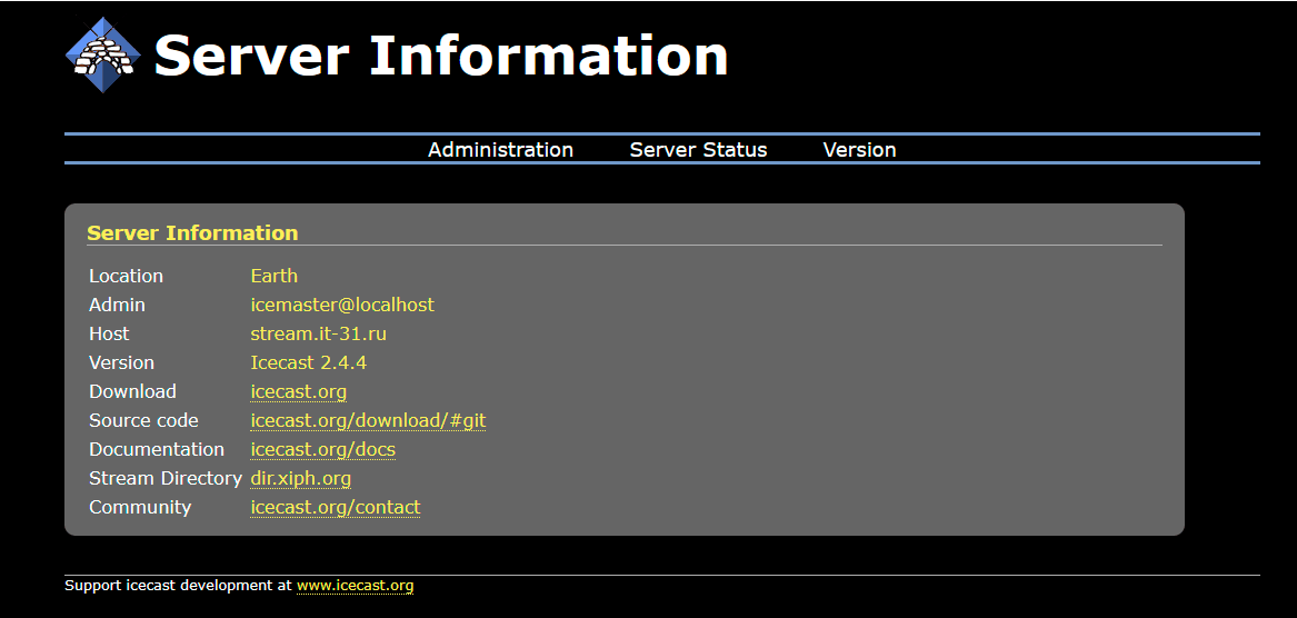 Теперь пробуем открыть в браузере адрес stream.it-31.ru:8000 и, если все сделано правильно, вы увидите веб-интерфейс сервера онлайн-вещания.