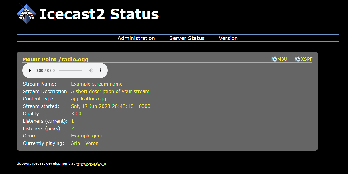 Если мы теперь перейдем в веб-интерфейс Icecast 2, то увидим там нашу трансляцию и даже можем ее прямо тут прослушать. Для плееров можете использовать ссылку http://stream.it-31.ru:8000/radio.ogg, либо сохраните данный адрес в текстовом файле с расширением M3U.