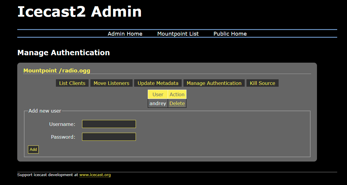 В опции mount-name указываем точку монтирования нашего потока, а в option name="filename" задаем файл для хранения паролей. Опция option name="allow_duplicate_users" позволяет включить многократные подключение одного и того же пользователя, по умолчанию выключено.