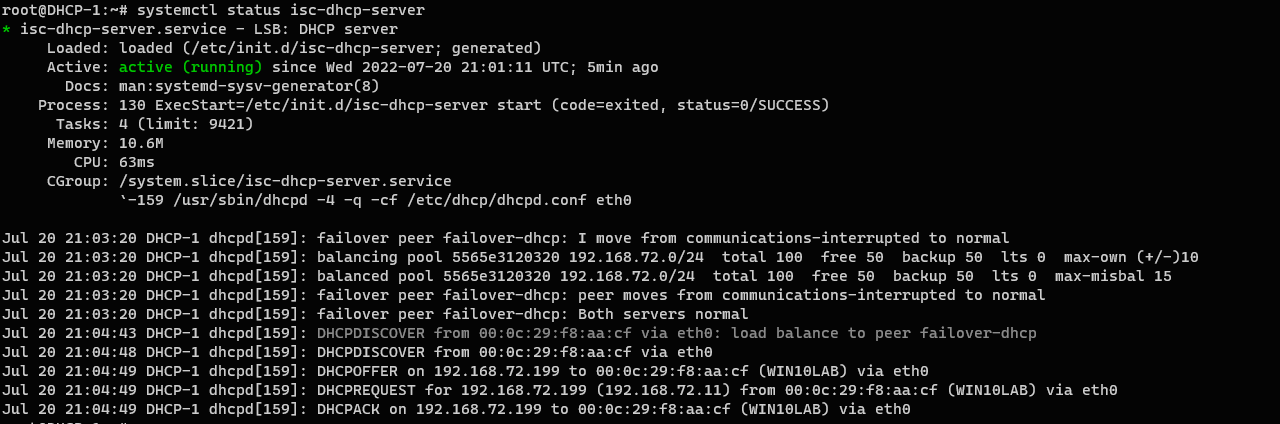 Отказоустойчивый DHCP-сервер строится по схеме первичного и вторичного узлов, которые могут работать как в режиме балансировки нагрузки (рекомендуется), так и в режиме горячего резерва. Отвечающие за это настройки мы рассмотрим ниже, а пока установим сам пакет ISC DHCP: