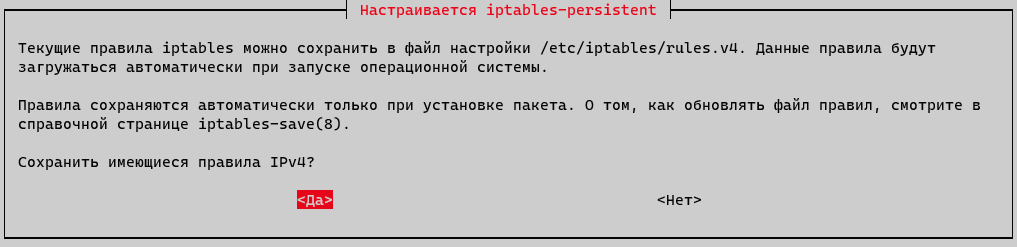После чего установим пакет iptables-persistent для автоматической загрузки правил iptables: