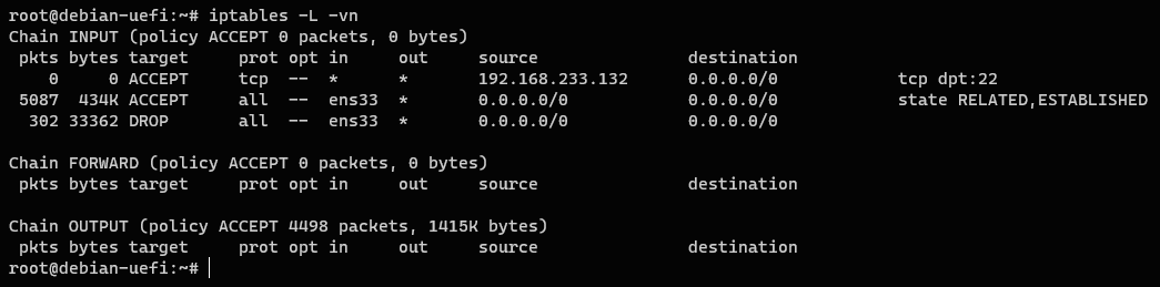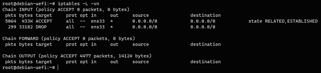 5iptables -A INPUT -i ens33 -j DROP
