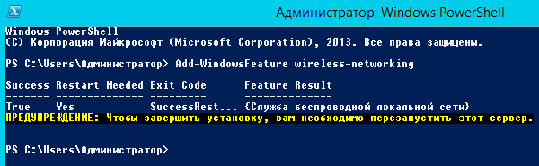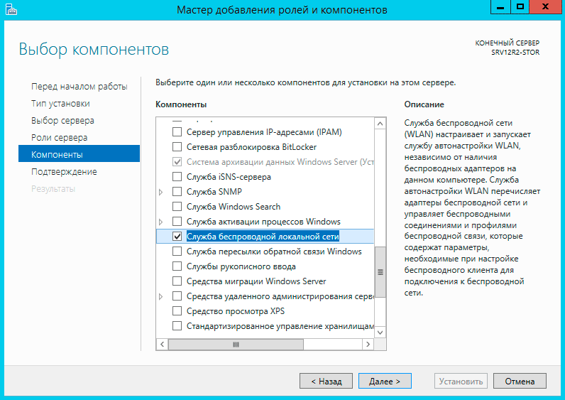Для того, чтобы Windows Server мог работать с беспроводными сетями следует установить компоненту Служба беспроводной локальной сети, после чего сервер потребуется перезагрузить.