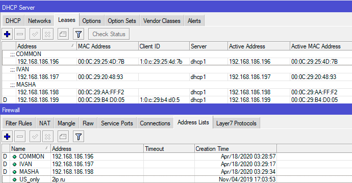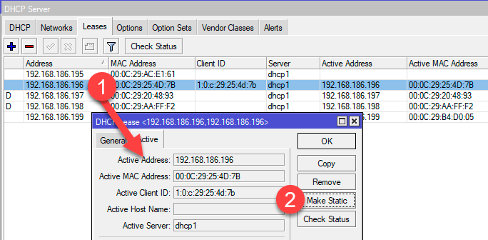 Перейдем в раздел DHCP Server - Leases и зарезервируем за каждым устройством сетевые настройки. Для этого выбираем нужное устройство в списке, открываем его свойства и нажимаем Make Static.