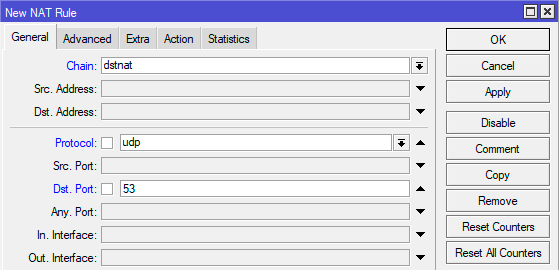Перенаправлять запросы клиентских устройств на нужные нам DNS можно сделать различными способами, мы будем использовать перехват пакетов на роутере, что позволит одновременно организовать защиту от ручного изменения настроек на клиенте. Для этого перейдем в IP - Firewall - NAT и добавим новое правило. Закладка General : Chain - dstnat, Protocol - udp, Dst.Port - 53.