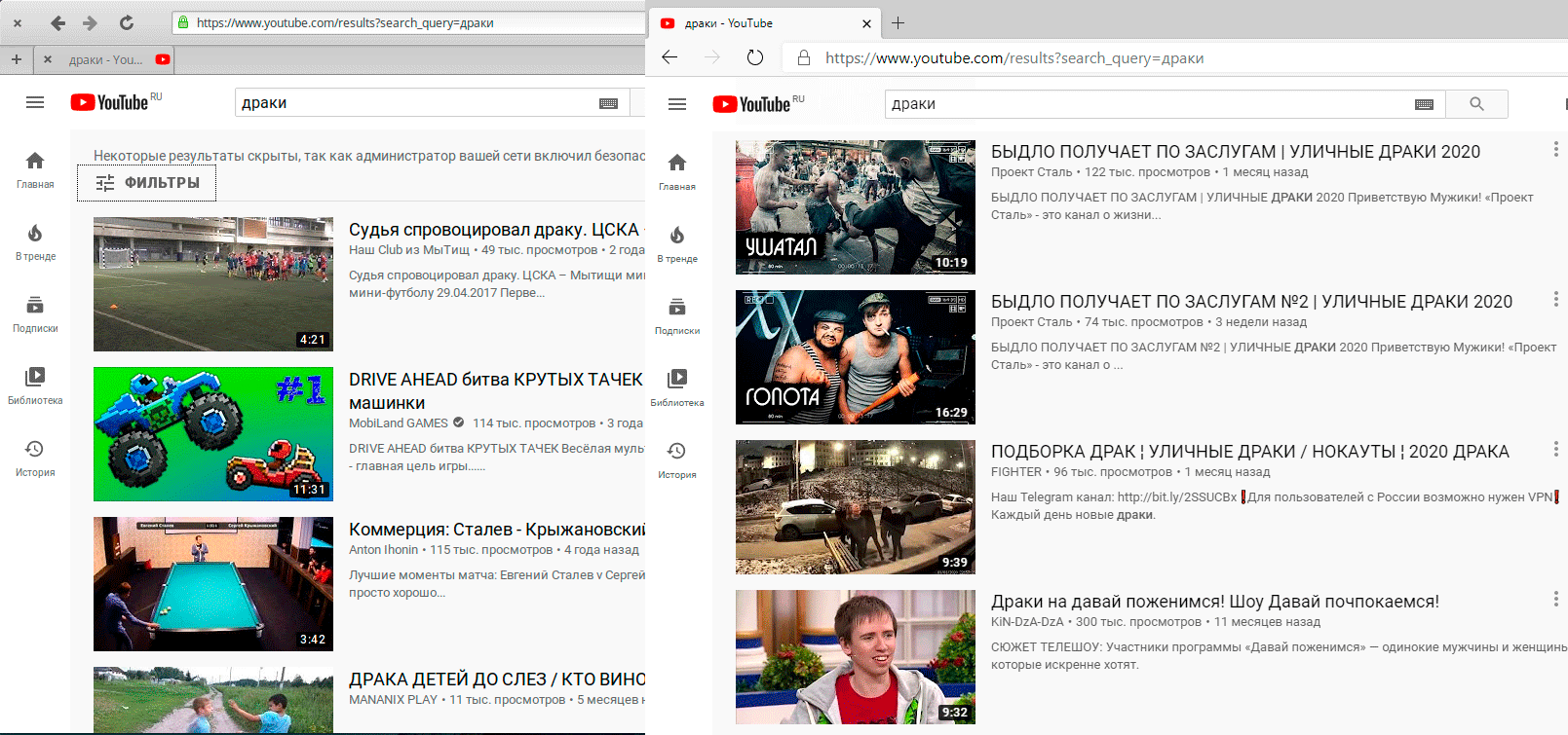 Отлично, все работает. Кроме фильтрации сайтов данный сервис принудительно включает безопасный режим для Youtube и эффективно контролирует содержимое его роликов. Сравним выдачу по одному и тому же запросу через SkyDNS и обычный DNS-сервер: