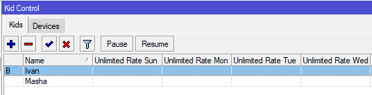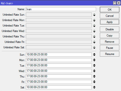 Ограничение времени пребывания в сети - вторая по актуальности задача родительского контроля. В актуальных версиях RouterOS для этой цели есть специальный инструмент. Для его настройки перейдем в IP - Kid Control и на вкладке Kids добавим записи для каждого ребенка и группы устройств общего пользования, если доступ нужно ограничивать и к ним. В открывшемся окне добавляем промежутки времени для каждого дня недели в которые будет разрешена работа, таких промежутков может быть несколько.
