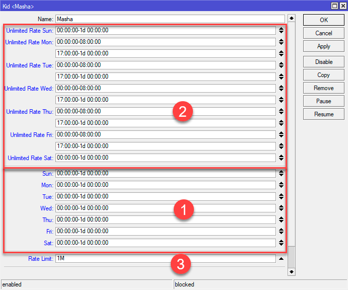 Кроме блокировок мы можем задавать ограничение скорости интернета, для этого придется в первую очередь заполнить время доступа, если этого не сделать, то будет считаться, что работа пользователя запрещена, затем выше, в полях Unlimited Rate для каждого дня недели указываем промежутки, когда возможен доступ без ограничения скорости, таких промежутков может быть несколько. И наконец в самом низу, в поле Rate Limit указываем ограничение скорости, в нашем случае 1 Мбит/с.