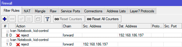 4add action=reject chain=forward reject-with=icmp-network-unreachable src-address-list=IVAN
