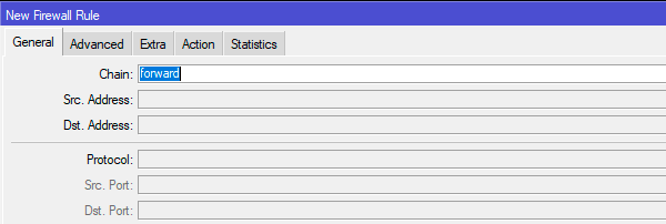 Для начала рассмотрим первый вариант. Допустим мы хотим разрешить доступ с 10:00 до 23:00 вы выходные и с 17:00 до 23:00 в рабочие дни. Переходим в IP - Firewall - Filter и создаем новое правило. На закладке General указываем цепочку для транзитного трафика: Chain - forward.
