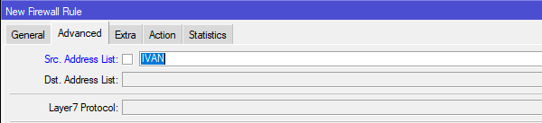 И завершаем наш набор правил запрещающим, для него мы заполняем закладки: General - указывая цепочку Chain - forward, Advanced - задав список адресов в Src. Address List и Action - reject.