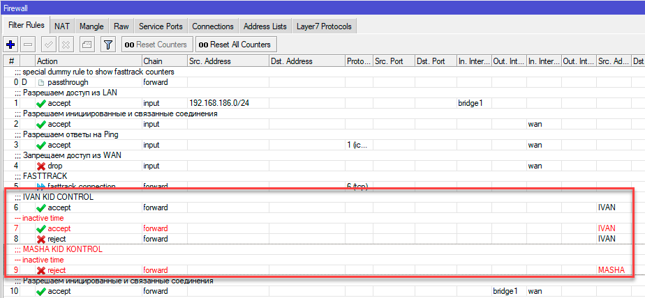 Данные правила следует разместить в самом начале цепочки FORWARD (т.е. выше всех остальных правил), также не забывайте снабжать правила понятными комментариями. Неактивные правила также будут выделены красным цветом и комментарием # inactive time.