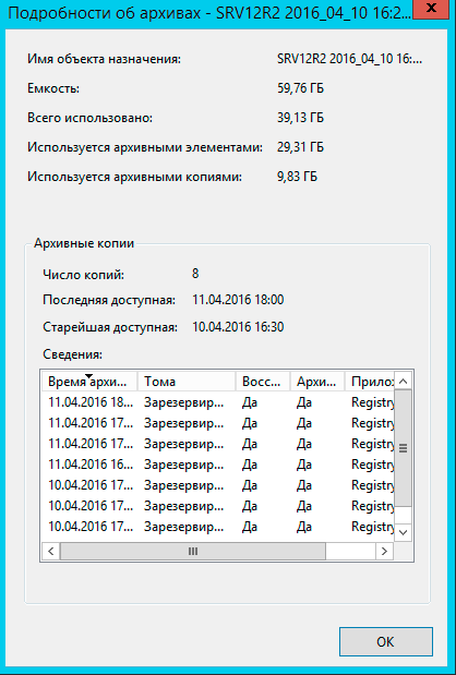 Мы немного забежим вперед и покажем результат архивирования тестового сервера с объемом архивируемых данных размером 29 ГБ: