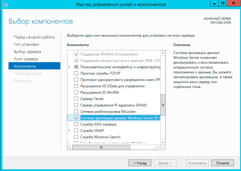 Для того, чтобы начать использовать систему архивации Windows Server сначала нужно установить одноименный компонент, это делается через Мастер добавления ролей и компонентов.