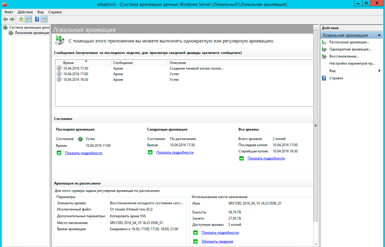 Беглый взгляд на экран сразу позволяет оценить текущие настройки и состояние службы, доступные действия сосредоточены справа. Их немного: Однократная архивация, архивация по расписанию и восстановление. Нас прежде всего интересует расписание, хотя однократная архивация тоже довольно удобный инструмент, который позволяет быстро сделать копию состояния сервера перед какими-нибудь потенциально опасными действиями, чтобы была возможность откатиться на самое их начало.