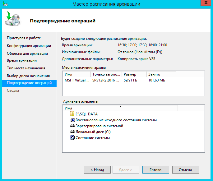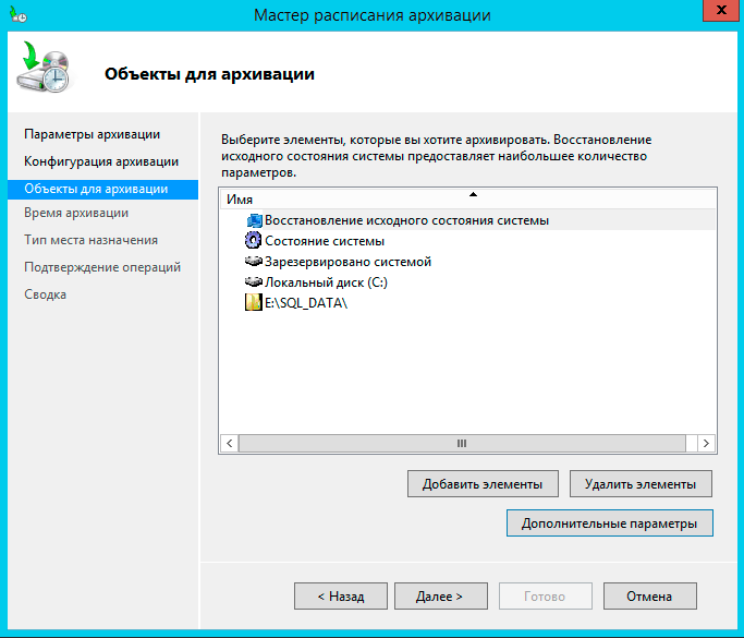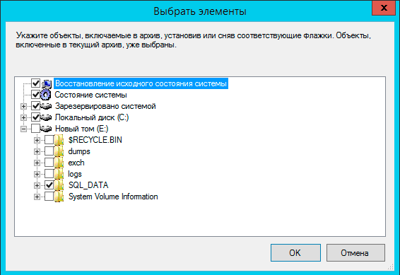 Если выбрать Восстановление исходного состояния системы, то автоматически будут добавлены Состояние системы, системный раздел (диск C:) и служебный раздел с загрузчиком. К этим данным мы в учебных целях добавили папку с базами MS SQL, которые должны представлять некие пользовательские данные.
