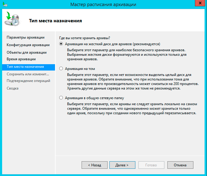 С расписанием разобрались, теперь самое время определиться с местом хранения архивов. На выбор предлагается три варианта, каждый из них довольно неплохо прокомментирован, что облегчает правильный выбор: