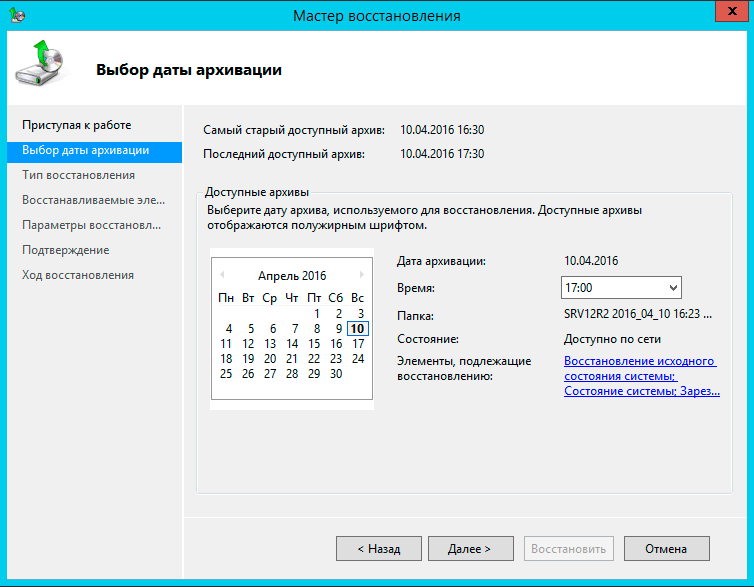 Затем указываем дату и время создания резервной копии на которую мы хотим откатиться, доступные даты подсвечиваются полужирным шрифтом.