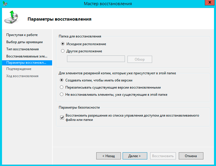 При восстановлении папок и файлов можно гибко управлять параметрами восстановления, например, сохранив обе версии файла: текущую и восстанавливаемую, это полезно в тех случаях, когда файл был случайно перезаписан, но результат текущей работы также нужен. При восстановлении можно также восстановить все права доступа на файлы и папки, что важно, если у вас используется сложная система назначения прав.