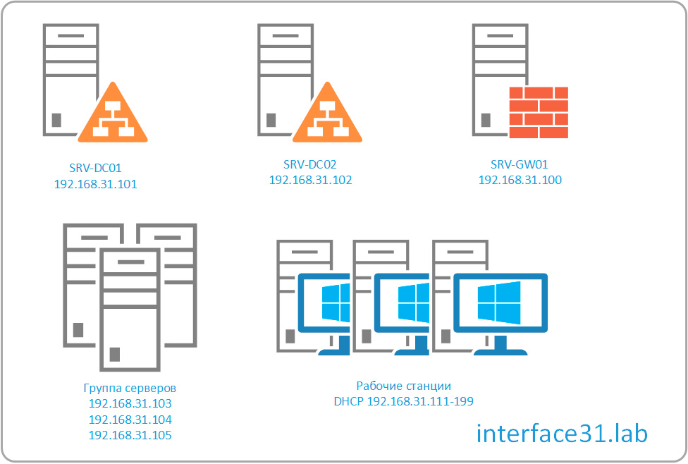 В наших примерах будет использоваться домен Active Directory с FQDN именем interface31.lab, за который отвечают два контроллера домена SRV-DC01 и SRV-DC02 с адресами 192.168.31.101 и 102 соответственно. Оба контроллера реализованы на базе Windows Server 2012 R2.