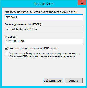 Обратите внимание, что несмотря на то, что в настройках внешнего интерфейса использован внешний адрес и шлюз, адреса DNS-серверов указаны внутренние. Также указана опция dns-search, которая определяет домен для разрешения не FQDN-имен. Это означает, что к каждому короткому имени будет автоматически добавлен указанный домен, например, srv-dc01 будет дополнено до srv-dc01.interface31.lab.
