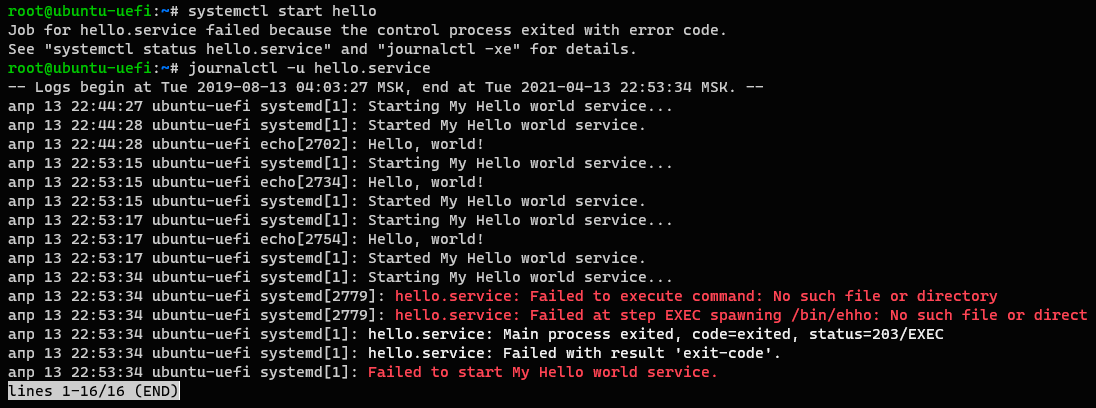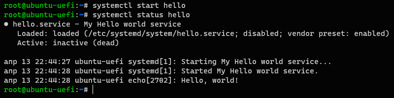 Вообще правильно было бы написать hello.service, но если мы не указали расширение юнита, то systemd по умолчанию считает, что мы запускаем именно службу. Состояние службы мы можем посмотреть командой: