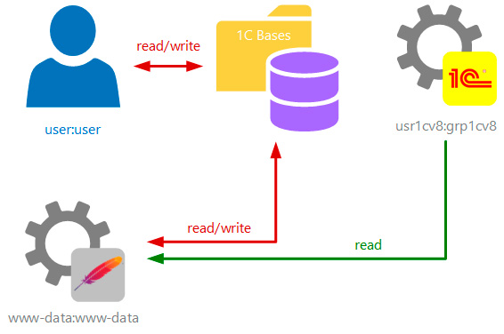 Итак, рассмотрим подробнее всех участников нашей схемы. Ключевую роль в ней занимает информационная база, права на модификацию которой должны иметь все подключающиеся к ней клиенты, а также исполняемые файлы платформы, к которым должен иметь доступ веб-сервер.