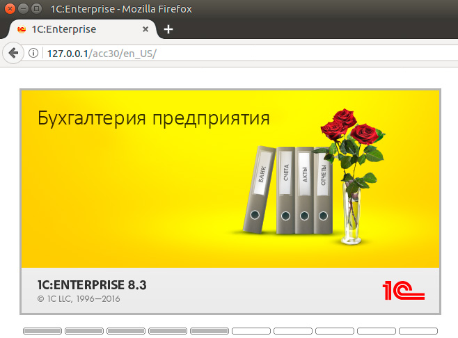 Теперь можем попробовать запустить базу, обратившись к ней в браузере по имени хоста или IP-адресу, добавив через слеш нужный алиас, на локальной машине можно набрать http://127.0.0.1/acc30.