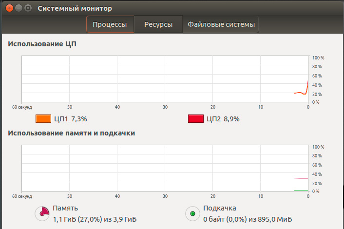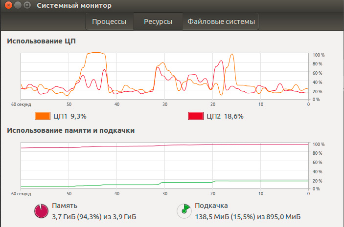 Если по процессорным или дисковым ресурсам вопросов не возникло, то вот расход оперативной памяти нас не порадовал. Ниже показана система сразу после загрузки: