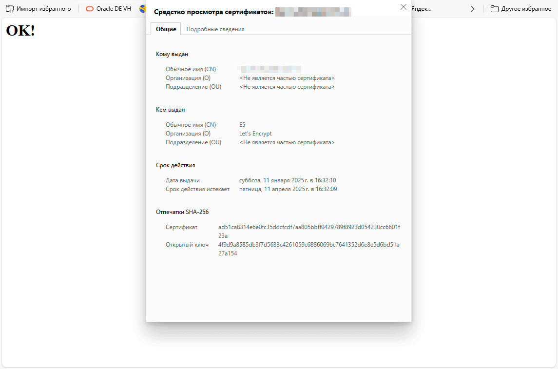 Теперь заходим на наш сайт, мы будем автоматически направлены на HTTPS версию и можем убедиться, что сайт получил сертификат от Let's Encrypt, а также использует (при поддержке со стороны браузера) TLS 1.3 и HTTP/3.