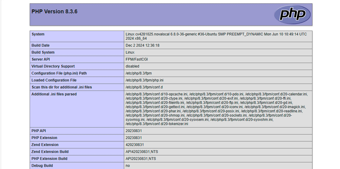 Если теперь в адресной строке браузера набрать site.example/info.php то увидим стандартную страницу с информацией о PHP, его настройках и установленных модулях.