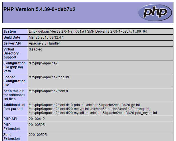 - Debian 7 Squeeze: Apache 2.2.22, PHP 5.4.39, MySQL 5.5.43