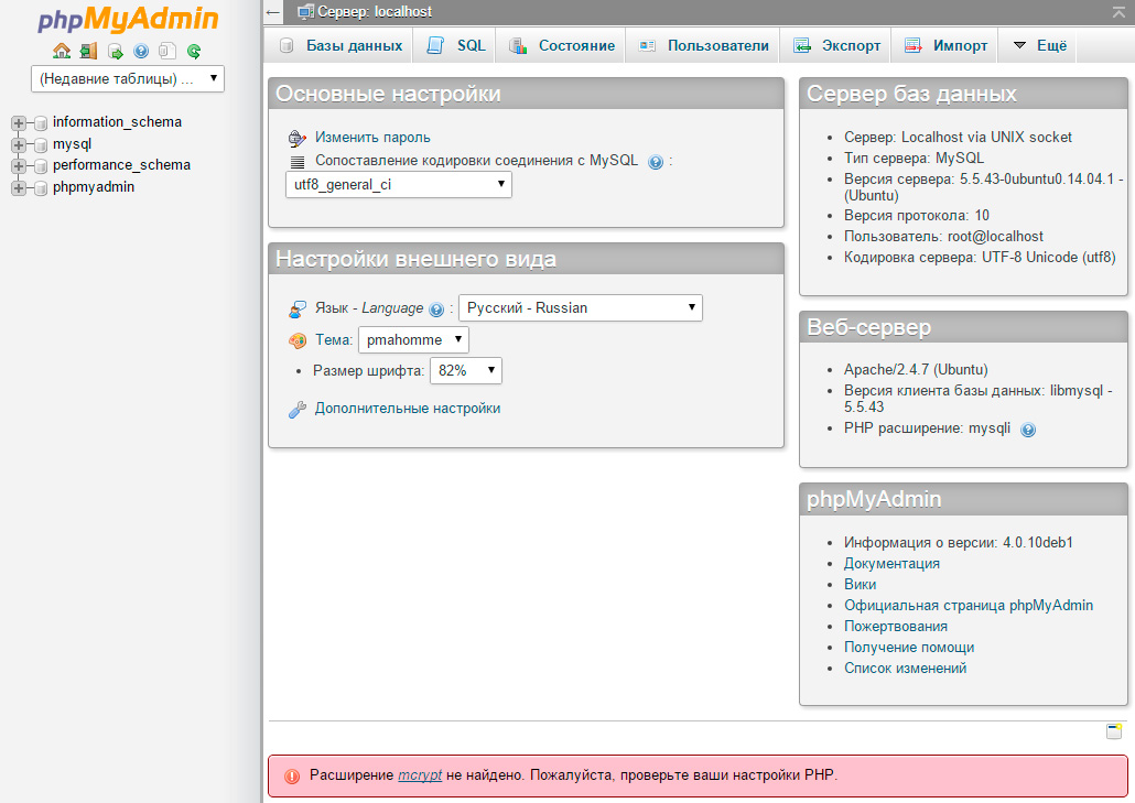 В Ubuntu 14.04 мы столкнулись с небольшой проблемой, утилита сообщила нам, что расширение mcrypt не найдено, хотя соответствующий модуль PHP был установлен среди зависимостей.