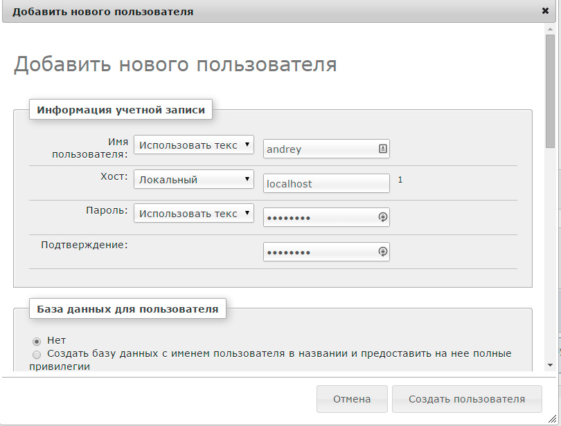 Никаких дополнительных настроек MySQL сервер не требует, благо кодировка UTF-8 стала стандартом де-факто. В принципе на этом можно закончить, но все базы данных размещаемые на сервере будут работать с правами суперпользователя MySQL, что небезопасно. Поэтому следует создать пользователей сервера баз данных с ограниченными правами, чтобы они могли управлять только своими базами.