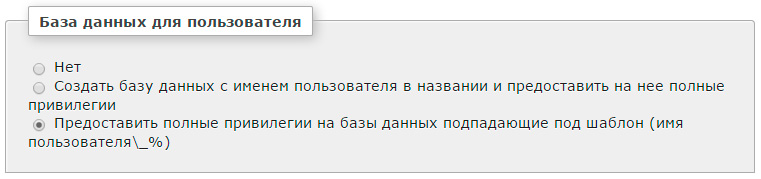 Теперь прокрутим страничку чуть ниже и установим опцию Предоставить полные привилегии на базы данных подпадающие под шаблон (имя пользователя_%)