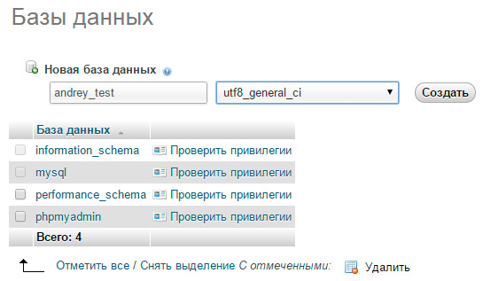 Для проверки создадим базу данных phpMyAdmin - Базы данных - Новая база данных.